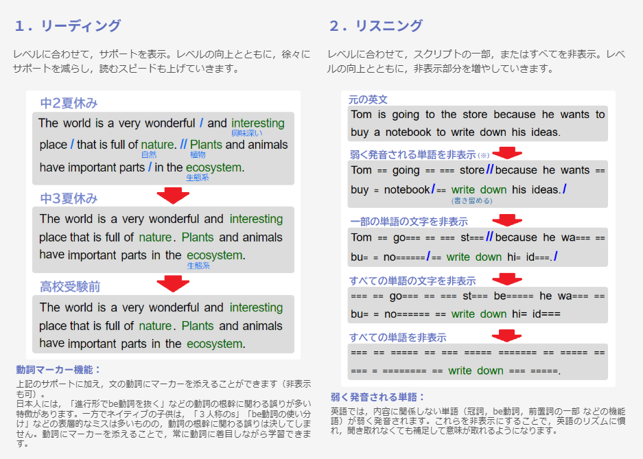 英文中をクリックすると文法解説が表示されるなど、学習者の理解をサポートする機能が充実しています。